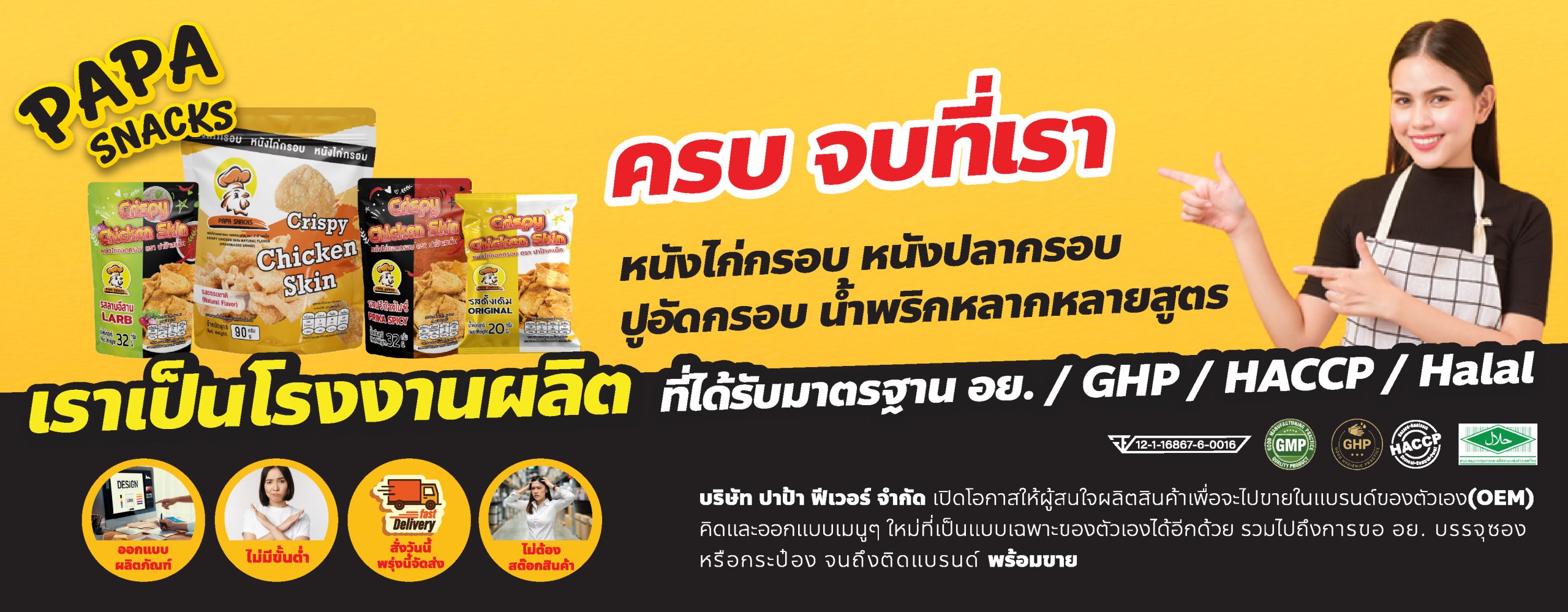 แบรนด์ PAPA Snacks ปาป้าสแน็ค ก่อตั้งขึ้นมาเพื่อขยายตลาด พัฒนาขนม ขบเคี้ยว ที่ดีต่อสุขภาพ เราเป็นโรงงานผู้ผลิต และจัดจำหน่าย หนังไก่กรอบ มีประสบการณ์การผลิตอย่างต่อเนื่องมากกว่า 9 ปี PAPA Snacks เน้น คัดสรร วัตถุดิบที่ดีที่สุด และได้ คุณภาพ มาตรฐาน